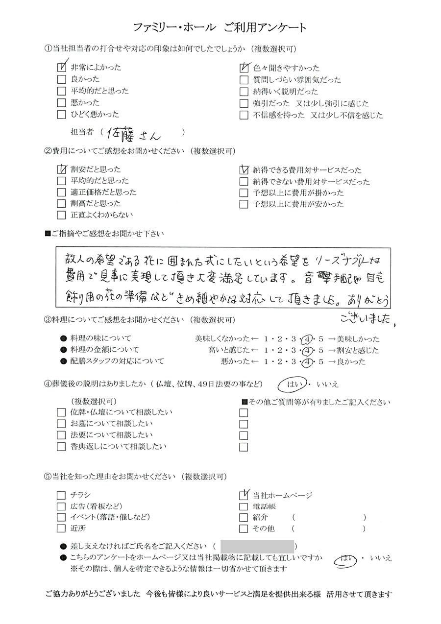 故人の希望である花に囲まれた式にしたいという希望を、リーズナブルな費用で見事に実現していただき大変満足しています。