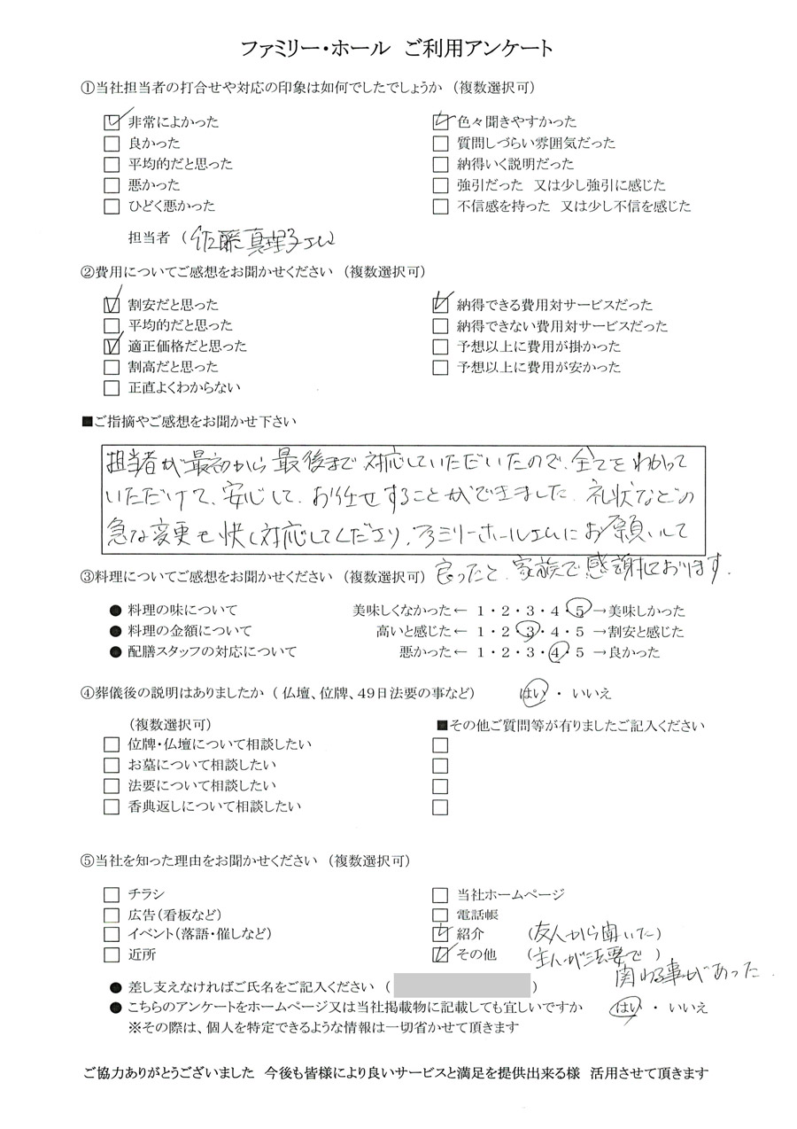 担当者が、最初から最後まで対応していただいたので、全てをわかっていただけて、安心してお任せすることができました。 礼状などの急な変更も快く対応してくださり、ファミリーホール高津斎場さんにお願いして良かったと、家族で感謝しております。