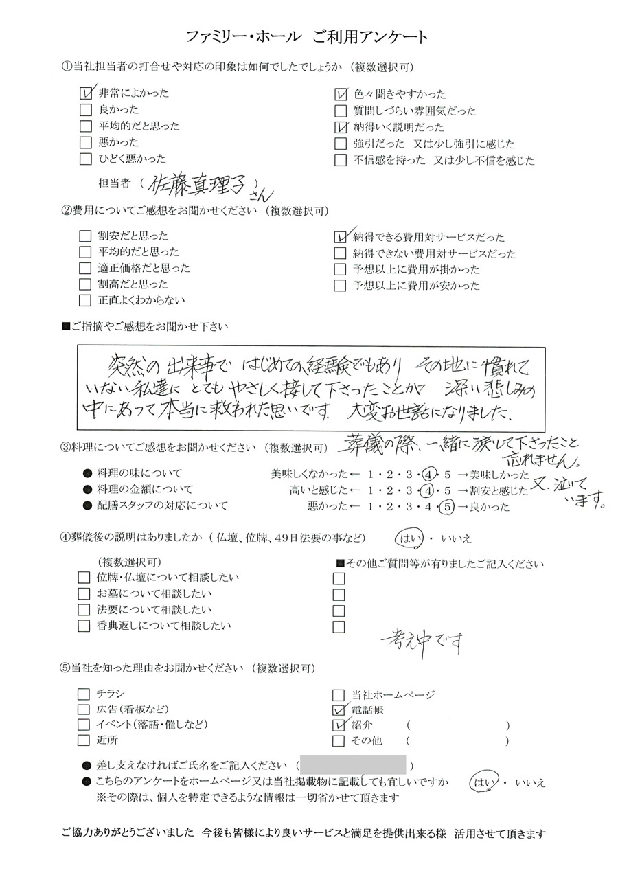 突然の出来事で、初めての経験でもあり、その地になれていない私達にとても優しく接してくださったことが、深い悲しみの中にあって本当に救われた思いです。