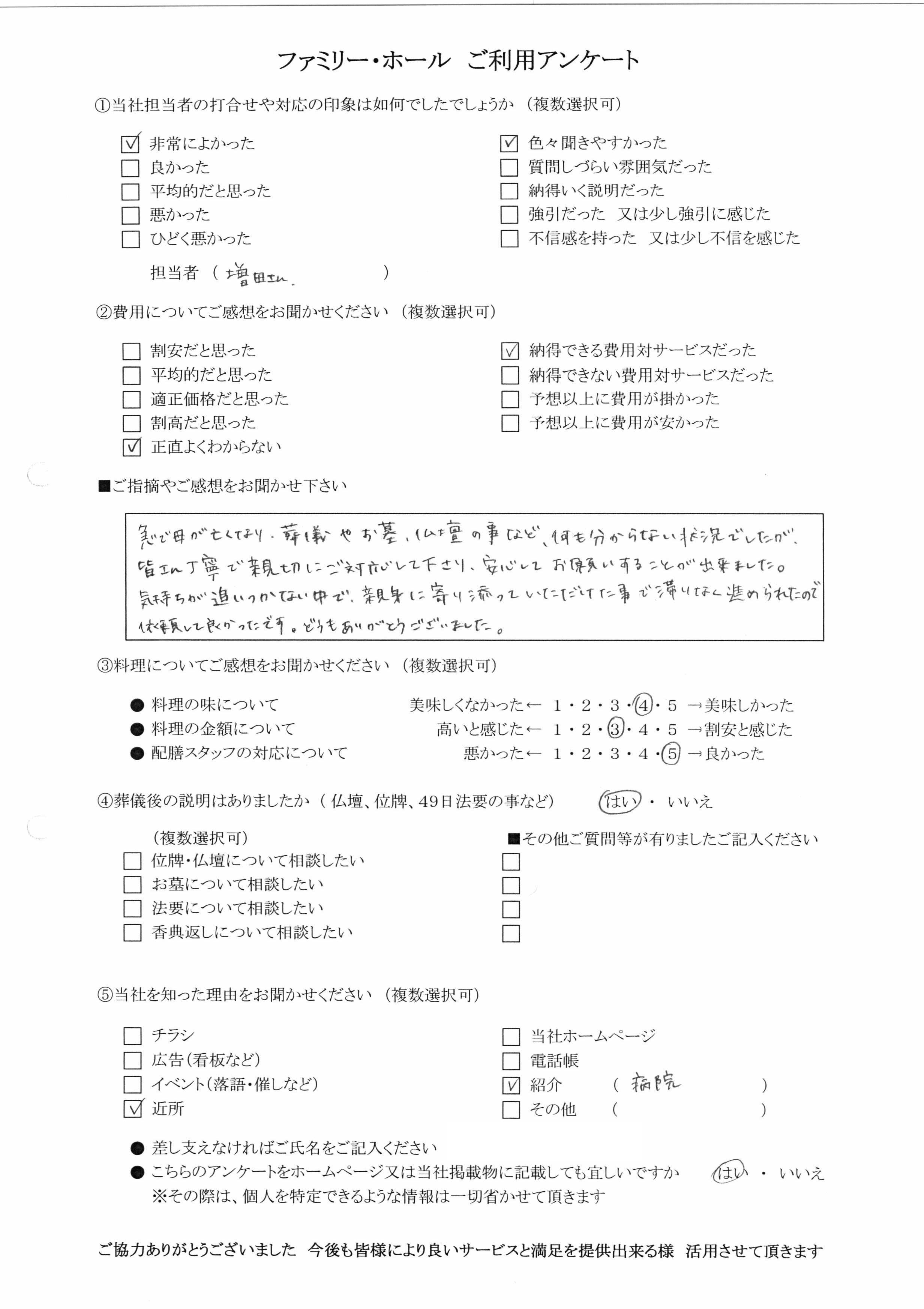 急に母が亡くなり葬儀やお墓、仏壇の事など何もわからない状況でしたが、皆さん丁寧で親切にご対応して下さり安心してお願いすることが出来ました。