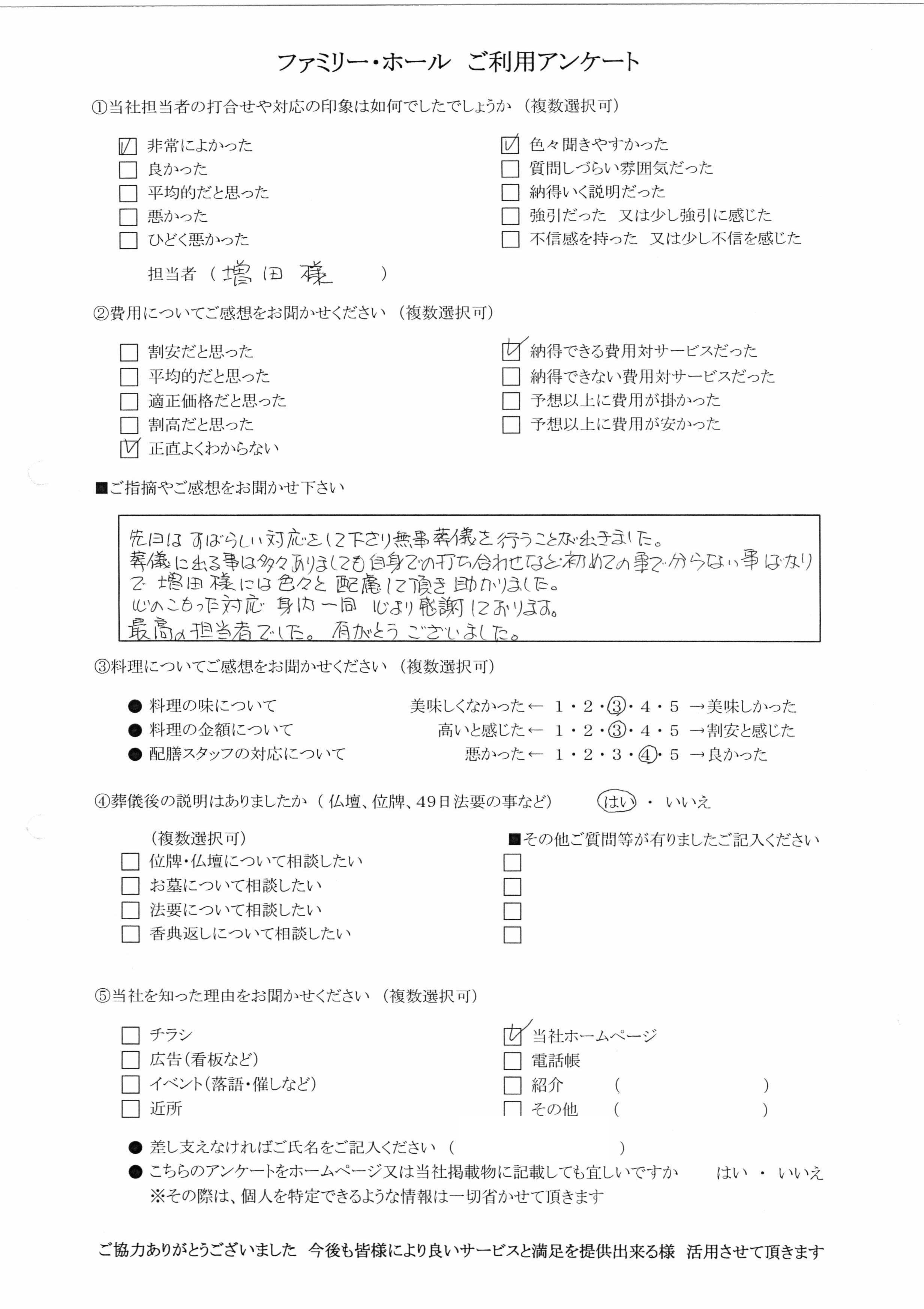 葬儀に出る事は多々ありましても自身での打ち合わせなど初めての事で分からない事ばかりで増田様には色々と配慮して頂き助かりました。