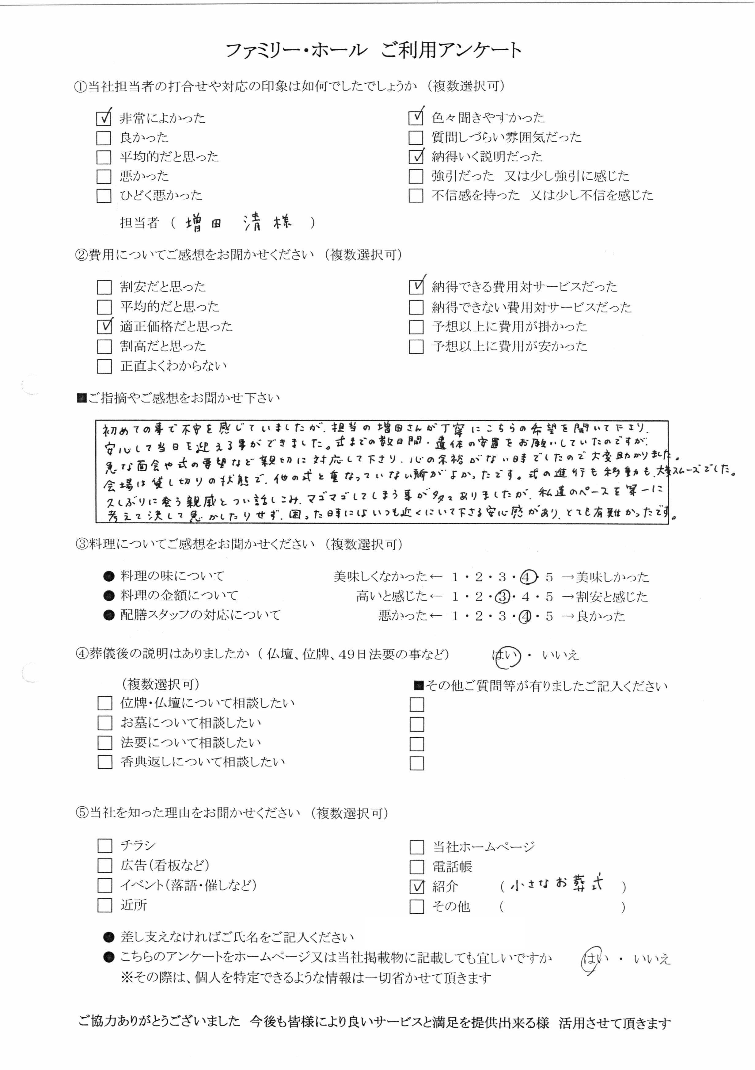 初めての事で不安を感じていましたが担当の増田さんが丁寧にこちらの希望を聞いて下さり安心して当日を迎えることができました。