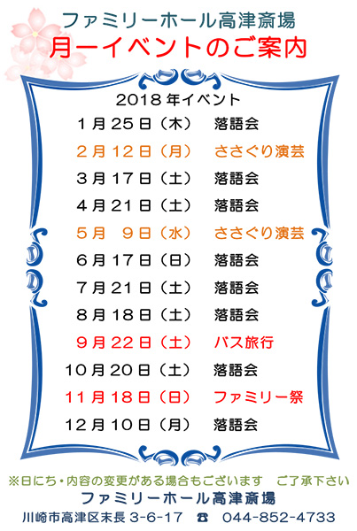 ファミリーホール高津斎場では、日頃から地域の皆さまに憩いの場として親しんでいただけたらとの想いから、月に一度どなた様にも自由にご参加いただけるイベントを開催しております。