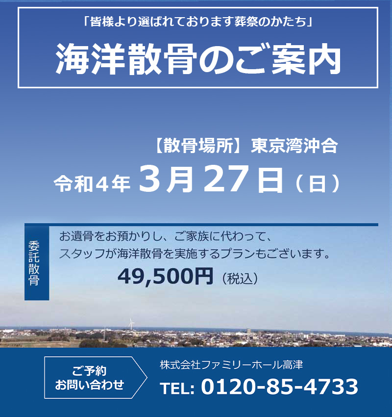 当社ファミリーホールが、ご家族に代わってスタッフが海洋散骨実施する委託散骨をご用意しました