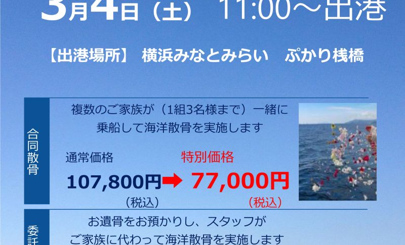 合同・委託散骨の次回出港日についてお知らせいたします。