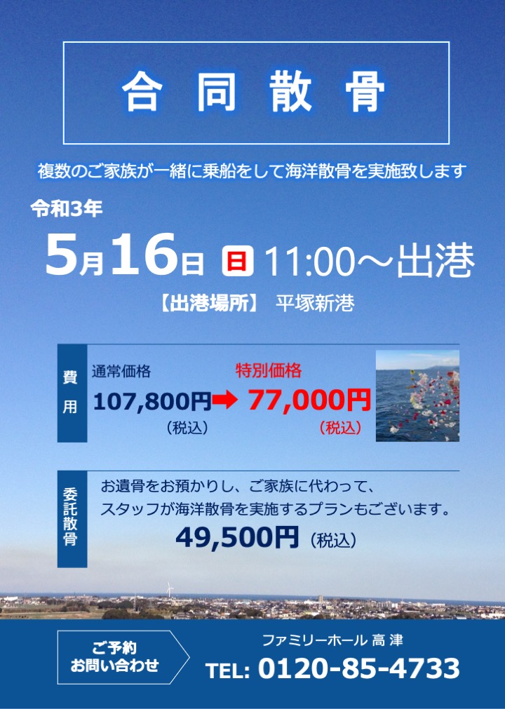 合同散骨は複数のご家族が乗船しご家族が行う散骨。委託散骨は遺骨をお預かりし当社スタッフが行う散骨です。